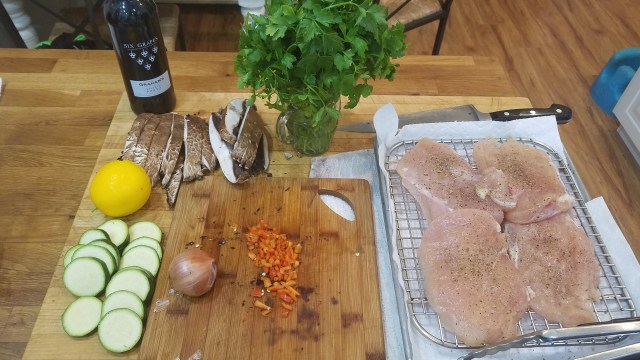 Quick skillet chicken with a pan sauce of Portobello mushrooms, shallots, sweet pepper, flat leaf parsley; rice, zucchini.
